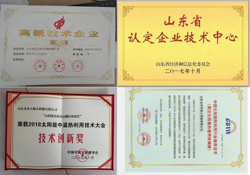山东龙光天旭太阳能有限公司成立于2002年,注册资本1亿元,公司坐落在有“舜帝故里“龙城之乡”美誉之称的诸城市, 是一家从事高硼硅特种玻璃及太阳能光热、光电、空气能等新能源产品研发、生产、销售于一体的高新技术企业,拥有自主进出口权。公司目前主要产品有:高硼硅太阳能玻璃管、太阳能热水器、中高温集热管、全玻璃真空集热管、无水防冻热管、太阳能集热工程、空气源热泵等系列产品。公司先后获得“山东**”、“山东省**商标”、“全国太阳能光热行业质量领先品牌”“守合同重信用企业”“山东优质品牌”等众多荣誉称号,是国家高新技术企业,拥有省级及市级科技研发平台两个,是全国太阳能标准化技术委员会委员单位,作为行业龙头骨干企业,天旭公司作为主要单位参与了《全玻璃真空集热管技术要求》、《平板型太阳能集热技术要求》等多项国家以及行业标准的起草工作。
